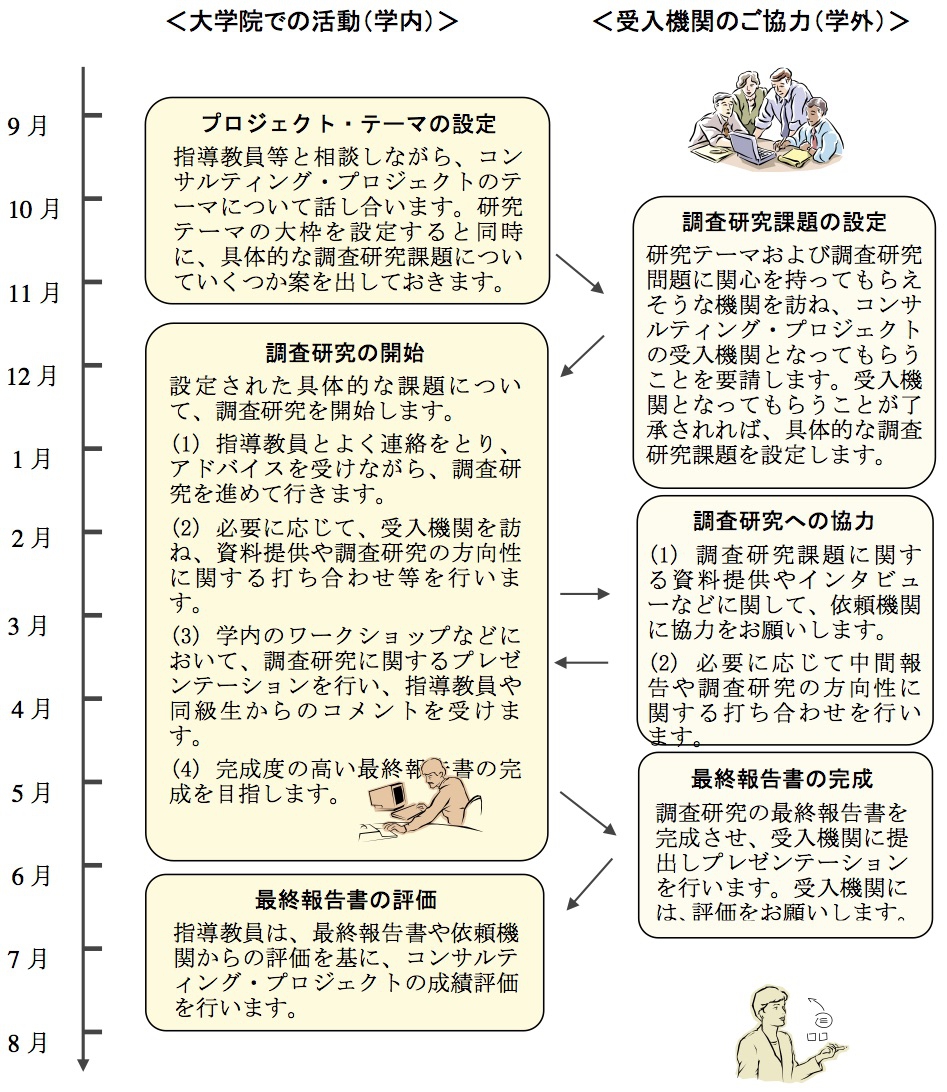 コンサルティング・プロジェクトの実施(Step4)に関しては、一つの標準形として、学生が月に1回程度、受入機関を訪ねて進捗状況の報告を行い、助言や支援を受けながら、約半年かけてコンサルティング・レポートを完成させるというプロセスを考えています。ただ、そのような標準形にこだわる必要はなく、同じようなプロセスを例えば2〜3ヶ月で完了させるということも考えられます。成績評価との関連で、2年次の7月末までに受入機関に最終版を提出してもらう(Step7)必要がありますが、その条件さえ満たせば、比較的自由にプロセスを設計することができます。