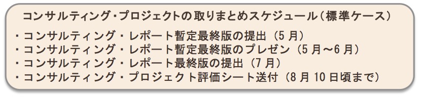 コンサルティング・プロジェクトは、具体的には以下の図のように進めて行く予定です。このプロジェクトは、1年次の終わり頃からスタートして、学生の修学状況や就職活動の状況に応じたスケジュールを個々に設計し、質の高い報告書を完成させることを目標としています。