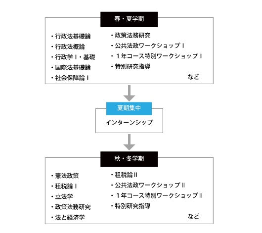 - 〈1年目夏期〉インターンシップ・プログラムを通じて、実務レベルで現実に行われている政策分析の手法と学ぶとともに、その改善方法について考察を深めます。インターンシップにおいては、夏期研修だけでなく、インターンシップの準備としての事前教育と、インターンシップで習得したものを確認するための事後教育も重視されます。また報告会が開催され、報告書の提出が求められます。