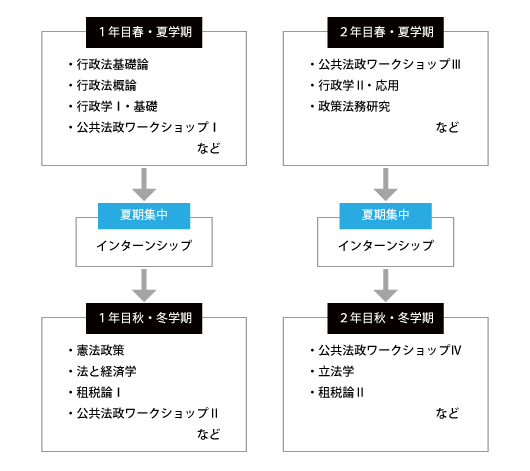 - 〈2年目春・夏学期〉ワークショップが開始され、法律学から政策を分析するにおいて、問題提起・分析枠組み・判例分析等の方法を学びます。
