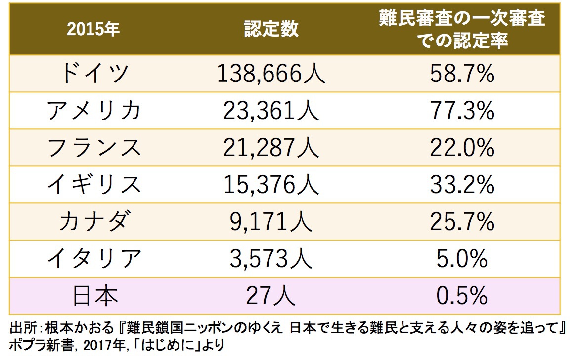 今回の講演でも、他の先進国(例えばG7諸国)と比べると、日本は難民受け入れ数が少なく、申請者に対する認定率で見ても非常に低いという事実を紹介して頂きました。根本(2017)で紹介されていた数字をまとめた左表でも、その事実を確認できます。